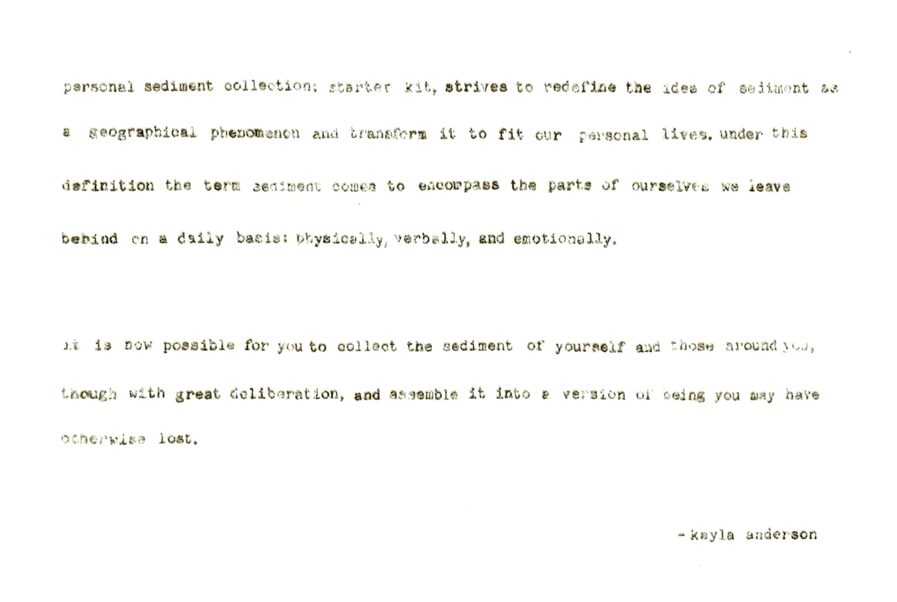 The first issue of the publication was a "Personal Sediment Collection Starter Kit" and instructed the reader on how to collect their own sediment and the sediment of those around them.