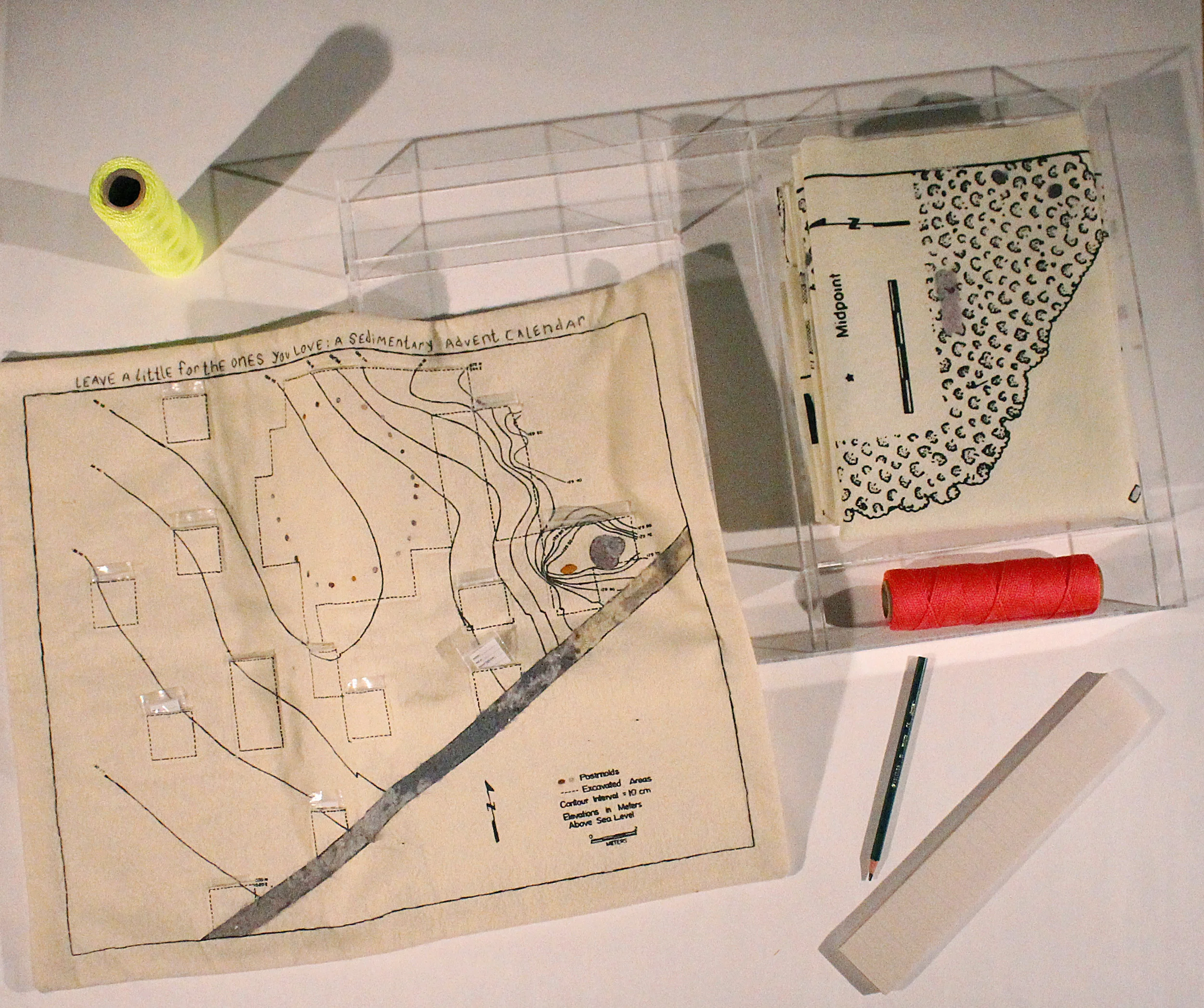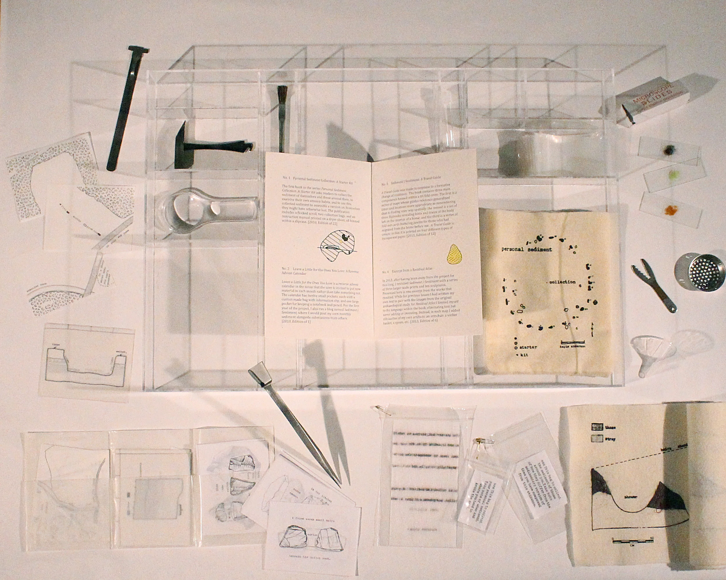 Sediment | Sentiment: Collector’s Edition is both a comprehensive collection of the publications and a kit to encourage other types of collecting. Alongside the publications are homespun tools for performing your own domestic, small-scale archaeological digs: miniature funnel and strainer for flotation analysis; bags, slides and test tubes for collecting a range of materials; and chisel, brush, and multi-functional tweezer-shovel for the real dirty (or dusty) work. The case itself acts as a traveling toolbox and a set of two collection trays for use in the field.